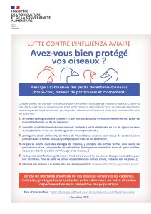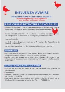 Il convient de prévenir le risque de diffusion de la maladie dans les élevages de volailles et de gibier à plumes du département, notamment auprès des particuliers détenteurs d’oiseaux captifs (basse-cour, oiseaux d’ornement, etc.) et des usagers de la nature (chasseurs, pêcheurs, promeneurs, etc.).